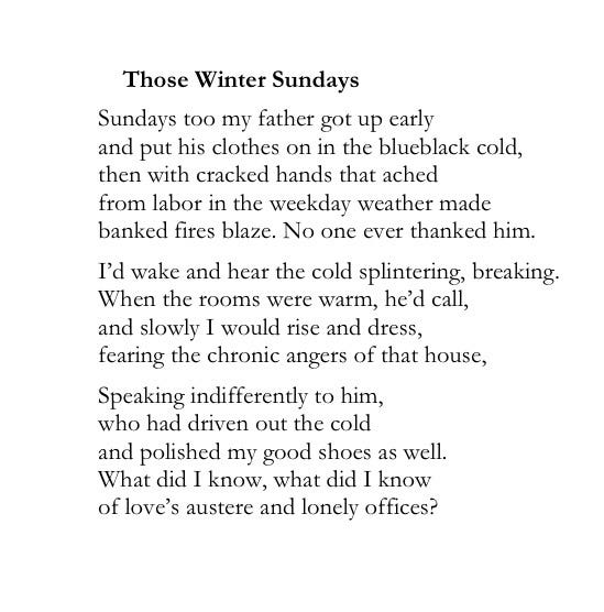 One of my favorite poems of all time, and certainly the poem I find myself thinking of most often, is Those Winter Sundays by Robert Hayden. It is a deceptively simple poem, three paragraphs describing the work a father undertakes for his son. Sally Rooney references it early on in her novel Intermezzo.